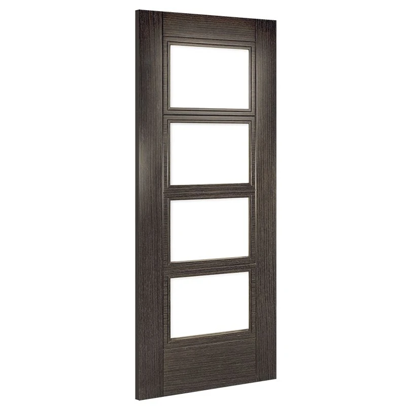 The Calgary features a statement Dark Grey Ash veneer and a bold crown-cut finish. Made with real aluminium inlays separating its 4 panels its a very popular door. Clear reinforced glass lends itself to functional living spaces for maximum light ingress. The Montreal are also available as a solid panel door.