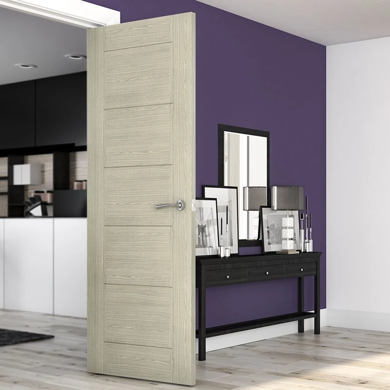 The Calgary features a statement Dark Grey Ash veneer and a bold crown-cut finish. Made with real aluminium inlays separating its 4 panels it’s a very popular door.