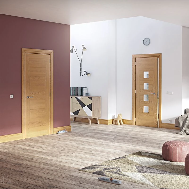The Pamplona Interior Prefinished Oak Door is a high quality, stable and beautifully finished door for any home or place of work. Because of its solid timber core, it has a heavy feel. Deanta Doors only use high quality A Gradeâ„¢ American White Oak Veneers when making their doors. They also are supplied with a thick, 15mm solid oak lipping to make them easier to fit and retain screws and hardware much better than other door styles.
