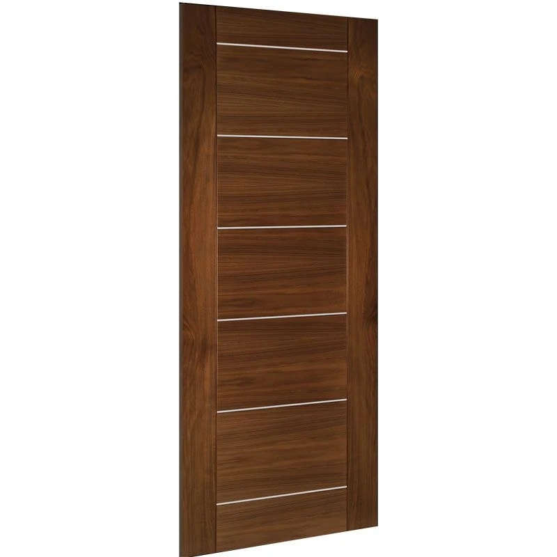 The Valencia is a beautiful Walnut closed grain, smooth finish American Black Walnut door. Made with real aluminium inlays separating its 5 panels its a very popular door. Supplied with 15mm solid black Walnut American lipping, its easy to trim and fit into your home.