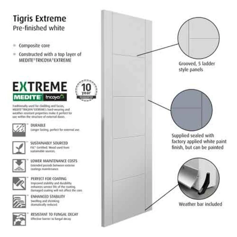 The JB Kind Tigris Extreme is a contemporary style, weather resistant exterior door. The JB Kind External Extreme collection consists of a fully finished selection of popular styles that are built with a durable, weather resistant Medite Tricoya Extreme top layer, making them perfect for painting over for your ideal colour preference.