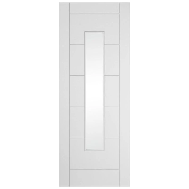 This door features a slim vertical glazing panel, optimising light flow between rooms. Primed in white and ready to be customised to suit your home design, this is a great compromise between light and privacy.