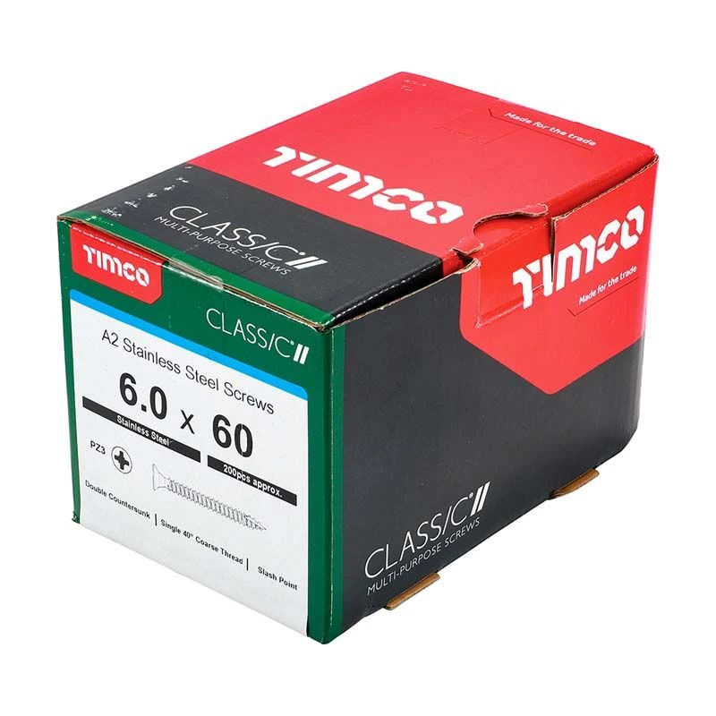 Timco Classic Multi-Purpose Screws – PZ – Double Countersunk – A2 Stainless Steel Box 200pcs – 6.0 x 60 – 60060CLASS Details