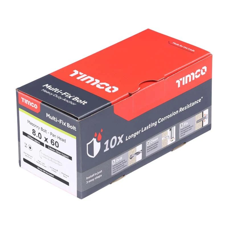 Timco Multi-Fix Masonry Bolts – Pan – Exterior – Silver Box 100pcs – 8.0 x 60/M10 – MF860P Details